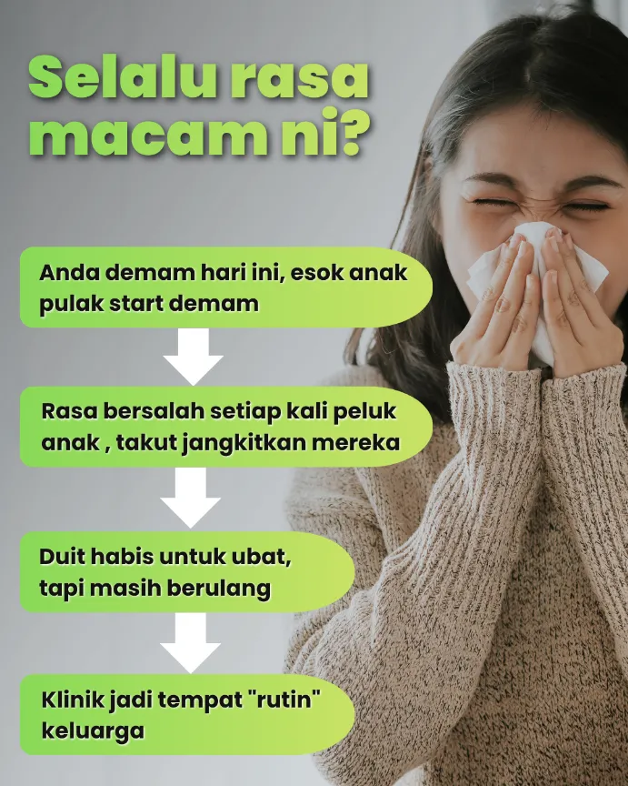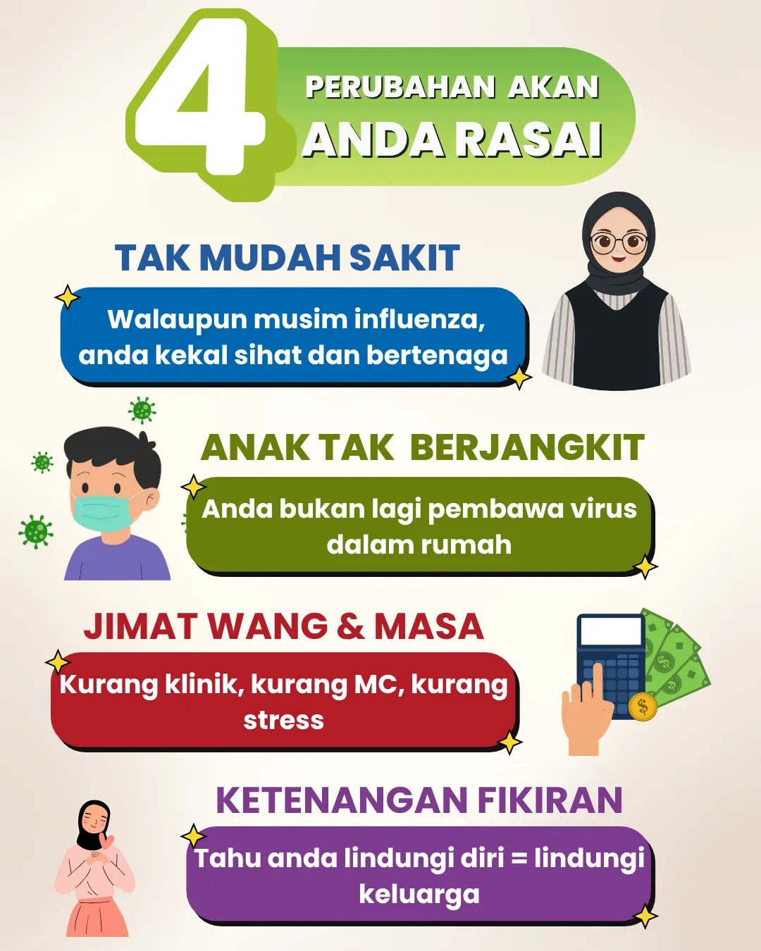 P.S. – Sistem imun yang kuat perlu masa untuk dibina. Semakin awal anda mula, semakin cepat keluarga anda dilindungi. Jangan tunggu sampai musim influenza puncak. Bertindak sekarang.